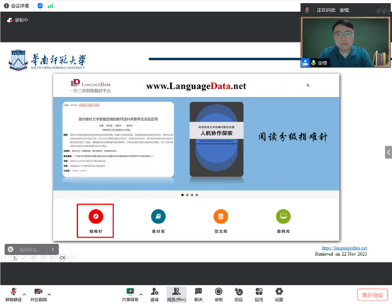 讲座过程中,金檀教授着重介绍了介绍了其开发的、并于2023年3月再次主持修订的阅读分级“指难针”。“指难针”参考了教育部颁布的《义务教育英语课程标准》《普通高中英语课程标准》和《大学英语课程教学要求》中提供的词表,聚焦于“难度定级”“词汇分析”与“句法分析”三大模块,从词汇、句法与篇章三个维度提供难度评估,有效地反映了源文本和目标文本的难度差异变化,为中国外语教学提供了有力支持。教师可通过对英语阅读素材进行语言难度调控,降低原始真实文本的复杂程度,增加语言可读性,使学生更好地理解文本的大致内容。“指难针”语料库的本土化、分析结果的分级化,帮助一线教师在素材改编的过程中控制难度,为学生提供更有针对性的教学,具有重要的实践意义。