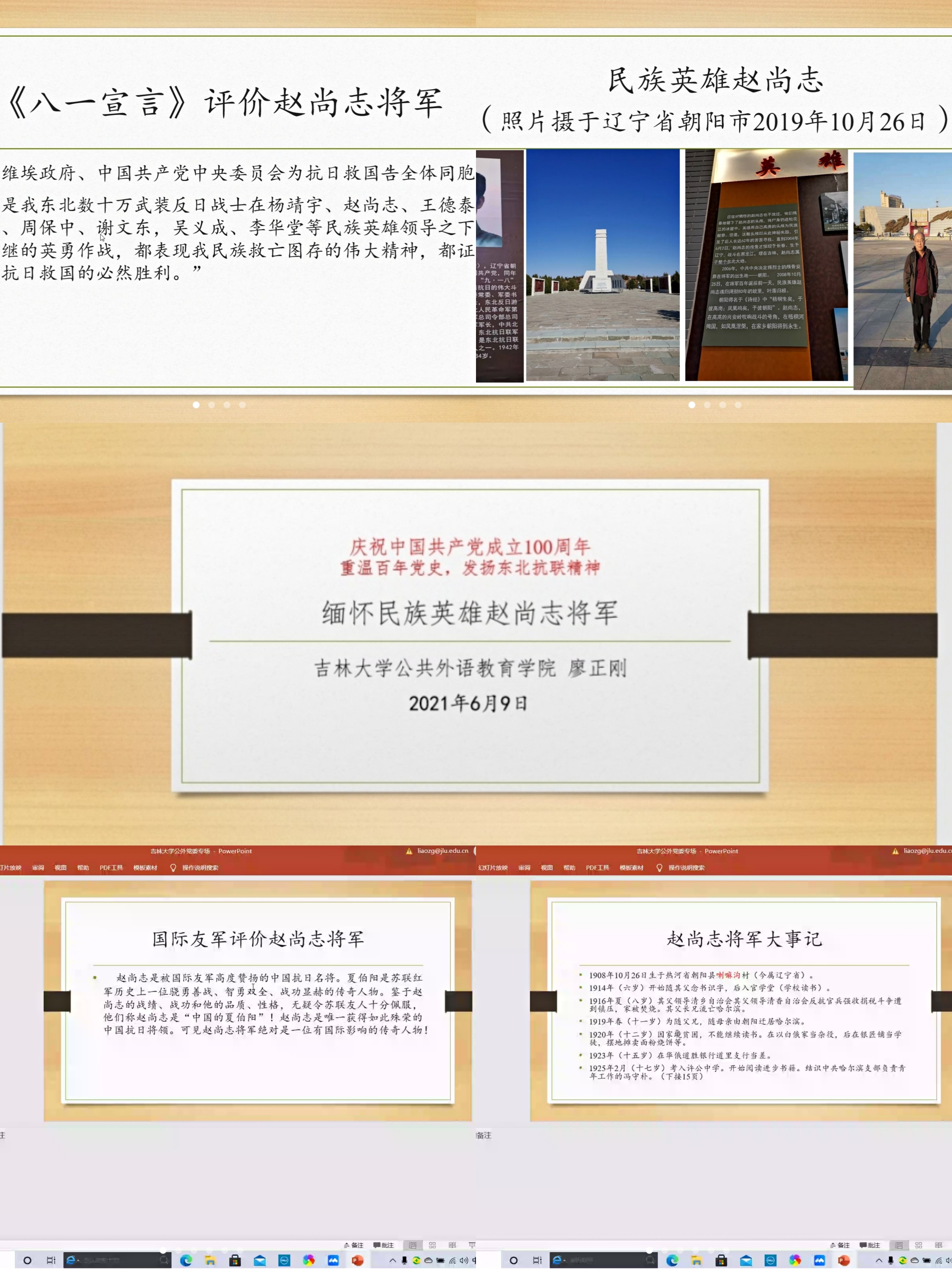 为认真领悟习近平总书记在党史学习教育动员大会上的重要讲话精神,做到学史明理、学史增信、学史崇德、学史力行,以优异成绩迎接建党一百周年,亿德体育(中国)体育官方网站党委联合教工第七党支部于2021年6月9日晚19时以线上形式召开“缅怀民族英雄赵尚志将军”主题讲座学习活动。主讲人为公共外语教育学院学术委员会委员、公共外语教育学院第七教研室主任、英语语言文学博士、硕士研究生导师廖正刚教授。会议由院党委副书记徐杰主持,学院领导班子成员及各支部党员参加了本次学习。