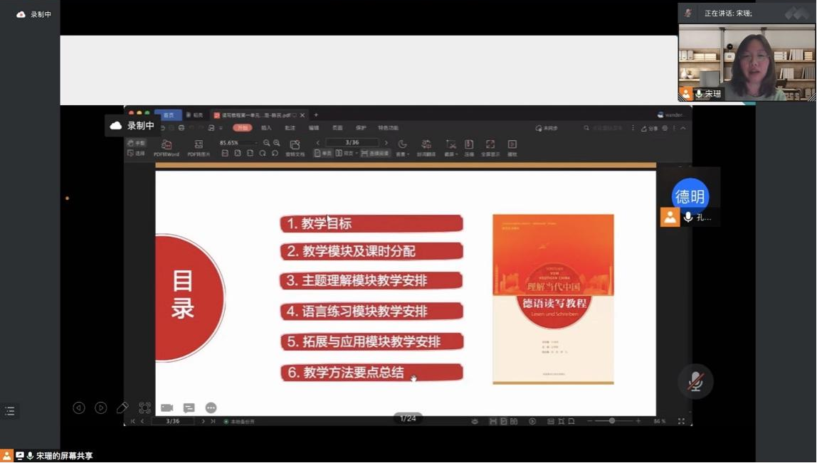 为进一步落实立德树人根本任务,深入推进非通用语课程思政建设,10月18日,公共外语教育学院德法教研室通过腾讯会议开展了“以《理解当代中国》为契机,开展非通用语思政教学”的主题研讨会。会议由德法教研室主任宋珊主持,德法党支部书记宇璐,以及教研室全体教师出席了本次会议。