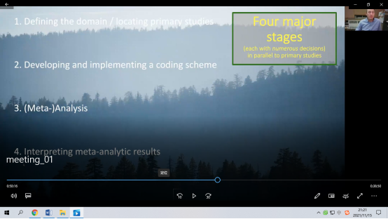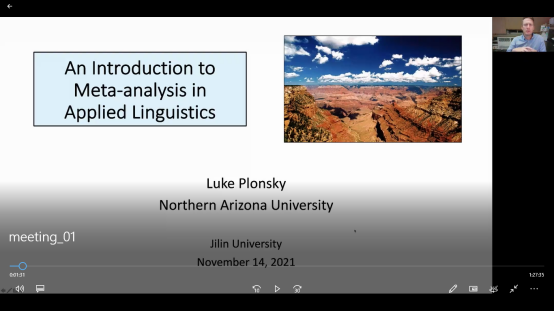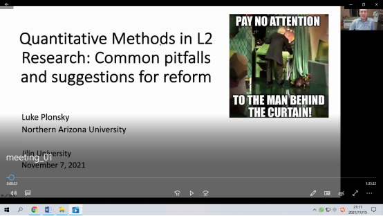 应亿德体育(中国)体育官方网站邀请,国际知名应用语言学学者美国北亚利桑那大学Luke Plonsky博士,分别于2021年11月7日和14日,开展了研究生学术素养提升系列在线讲座,讲座由研究生定量研究方法课程主讲教师申云化老师主持。针对我院外国语言文学研究生的课程设置、论文选题与人才培养实际,Luke Plonsky博士分别以二语习得领域的“量化研究”和“元分析”为主题,进行理论爬梳、文献述评与实证分析。