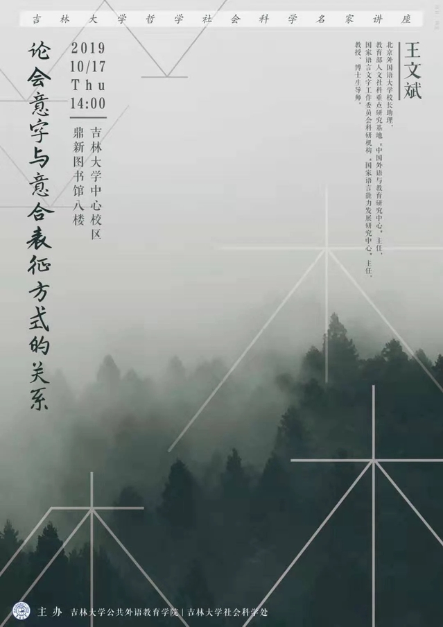 报告题目:论会意字与意合表征方式的关系报 告 人:王文斌教授 北京外国语大学讲座时间:2019年10月17日 下午14:00讲座地点:中心校区鼎新图书馆8楼学苑沙龙主办单位:亿德体育(中国)体育官方网站 吉林大学社会科学处