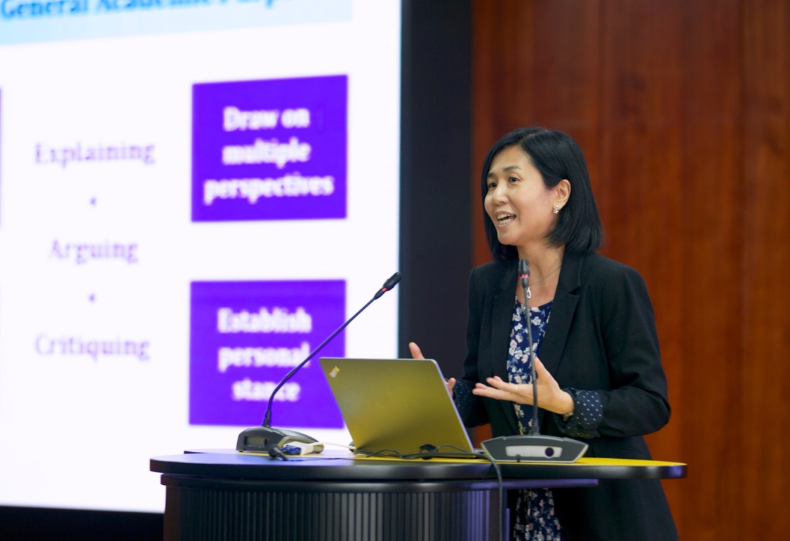 Lillian Wong博士做题为“English for Academic Purpose: Developing students’ academic literacy for university”的主题报告。她首先区别了EGAP(通用学术英语)ESAP(专用学术英语),介绍了学术语篇的五大要素及通用学术英语课程的具体课程模块,最后她列举具体的语篇向听众讲解学术语言的使用。她的讲座对于有学术写作需求的学生及教师以及从事学术语篇研究的研究者都有很大的启发和帮助。