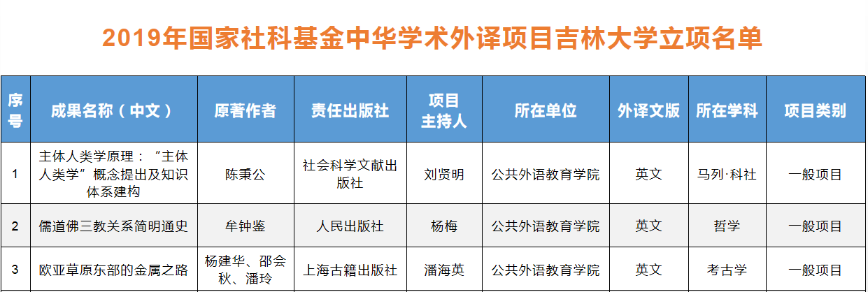 2019年12月25日,全国哲学社会科学工作办公室公示了2019年国家社科基金中华学术外译项目立项名单,共有154个项目进入公示名单,我校有3项入选,项目主持人均来自公共外语教育学院,立项数位列全国第十!