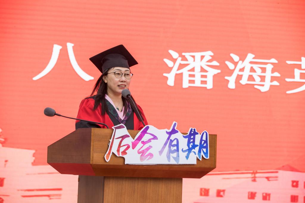 院长潘海英以“以梦为马 成就最美好的自己”为题发表了毕业寄语。潘院长回顾了与同学们共度的三年,“三年来,我们一起见证了伟大中国精神;三年来,我们一起见证了学院的快速发展; 三年来,我们一起见证了你们的华丽蜕变”。毕业之际,潘院长用“坚守心中信念,不负时代之期;追逐青春理想,书写人生华章;笑看百味人生,温柔对待自己”与同学们共勉。最后,潘院长祝福毕业生们都能成为有理想、有情怀、有担当的新时代“后浪”。