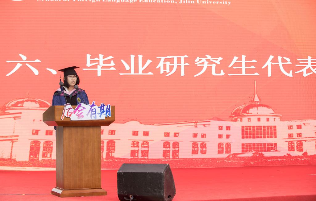 2020届毕业生冯孟楠代表全体毕业生发言。首先感谢学校为毕业生返校付出的辛苦和努力、学院尽力筹备毕业典礼。她回顾了三年来学习、研究、生活体验和成长历程,深切表达了对学院、老师的感激和祝愿,对同学、朋友的不舍之情,以及即将踏入新的征程的坚定信心。