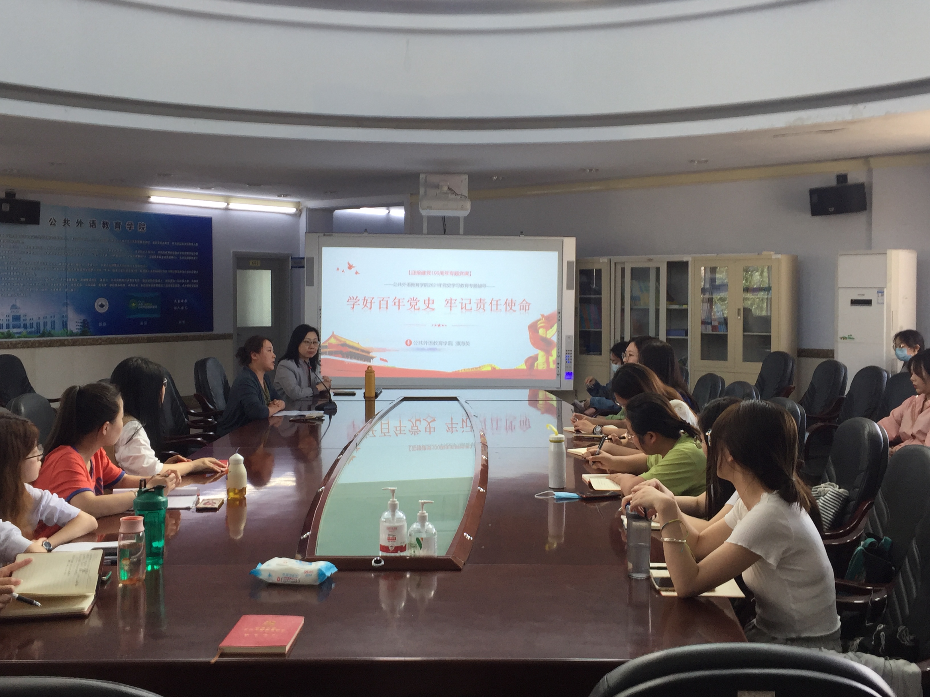 为庆祝中国共产党建党100周年,加深同学们对党的认识,提高学生的学习能力,坚定理想信念,2021年6月17日下午13:30,在外语楼六楼大厅公共外语教育学院潘海英院长为学院研究生一支部和二支部党员讲授了一堂以“学好百年党史·牢记责任使命”为主题的党课,院党委副书记徐杰主持此次活动,研究生辅导员曾媛列席。