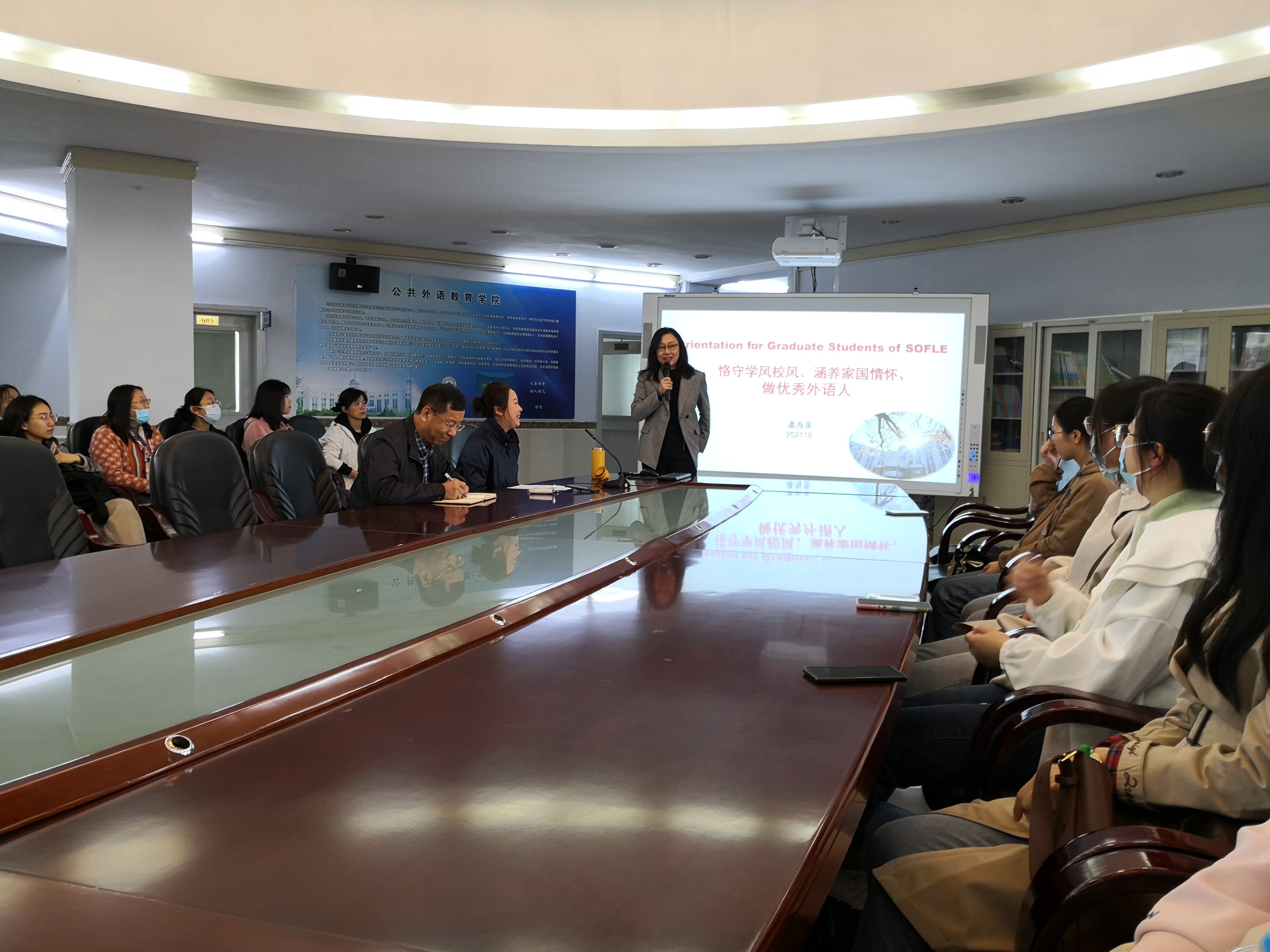为引导新生更好地规划研究生生活,明确未来的发展方向和人生目标,树立正确的人生观和价值观,2021年10月14日,公共外语教育学院院长潘海英在外语楼六楼报告厅为2021级研究生新生上了一堂以“恪守学风校风、涵养家国情怀、争做优秀外语人”为主题的开学第一课。讲座由学院党委副书记徐杰主持,党建工作联络员蒲韶华、辅导员曾媛以及全体2021级研究生新生参加讲座。