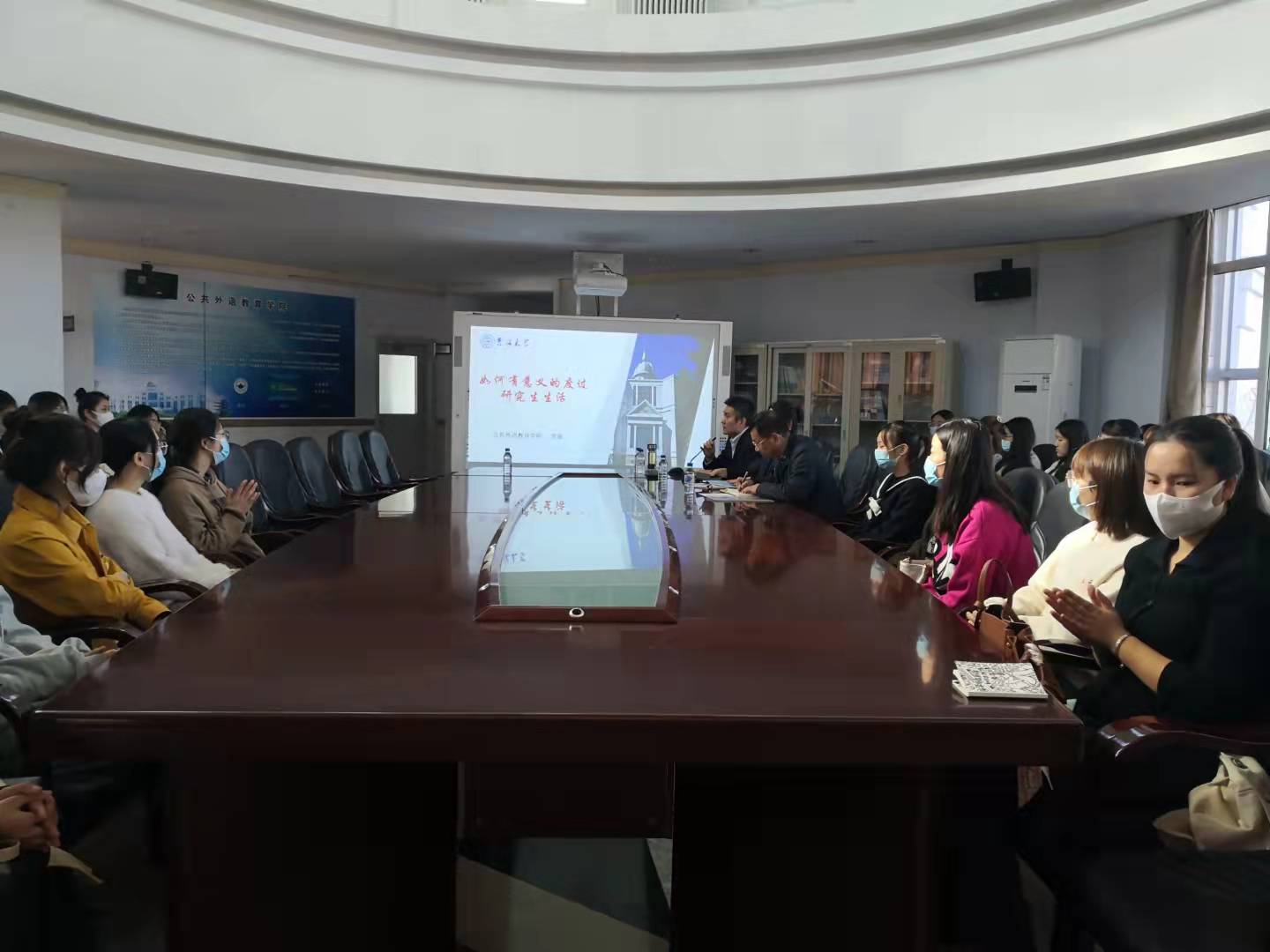 公共外语教育学院党委书记贺强为2021级全体研究生做了题为“如何有意义的度过研究生生活”的思想政治教育讲座。贺强书记从寻找定位、付诸行动、安全意识、心理健康、心得体会五个方面出发,为同学们进行耐心讲解,并通过丰富的案例,寓教于乐,对校园安全常识和心理健康知识信手拈来,讲座气氛欢快轻松,故事分析引人深思,同学们也认真倾听并记录,收获颇丰。