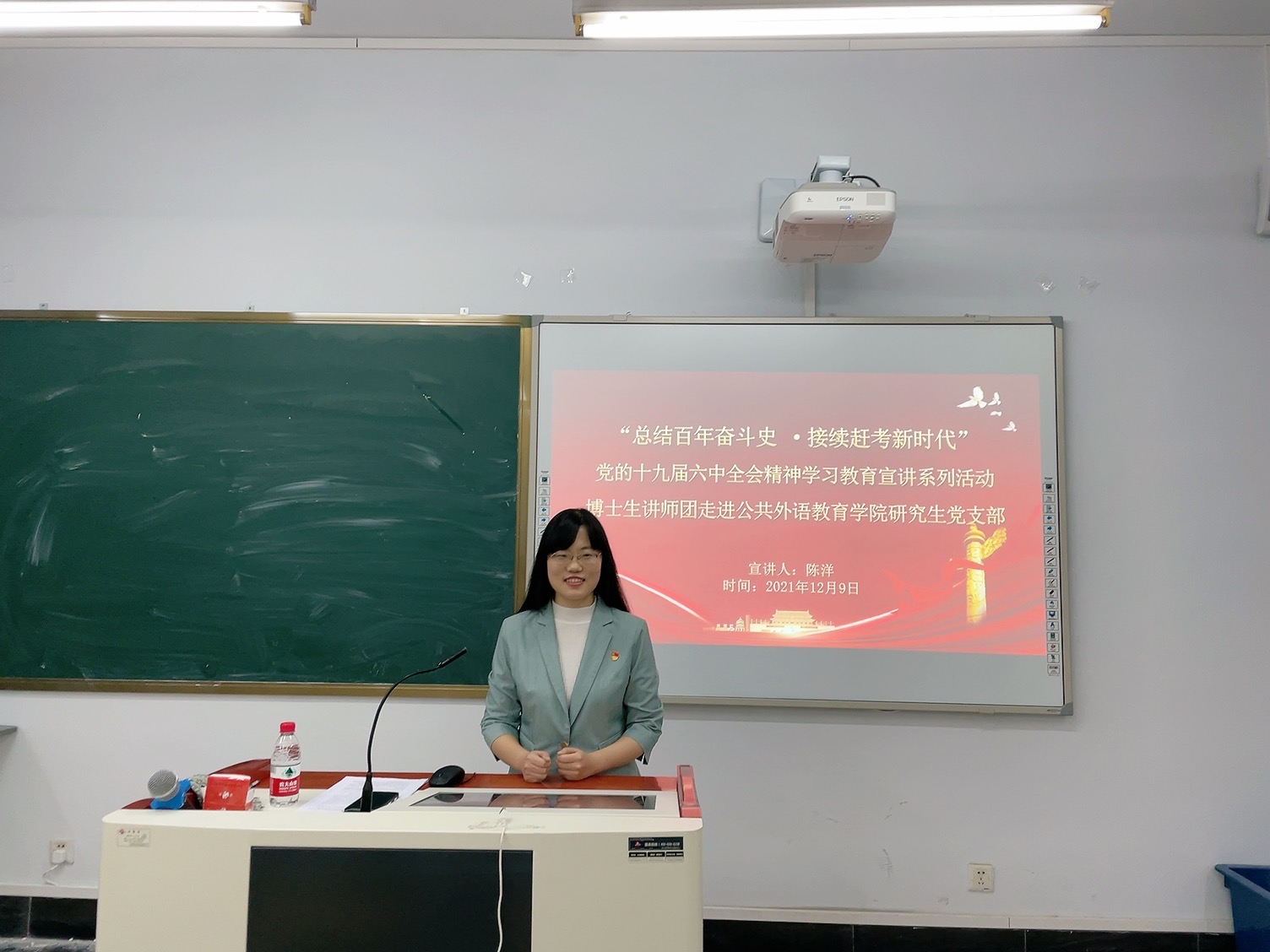 为深入学习贯彻党的十九届六中全会精神,提升广大研究生思想政治素质,积极响应校党委研究生工作部工作要求,2021年12月9日,公共外语教育学院邀请吉林大学博士生讲师团讲师陈洋博士于经信楼D401进行了十九届六中全会精神学习教育宣讲。本次宣讲的主题为“总结百年奋斗史•连续赶考新时代”——从党的百年奋斗史中汲取前进力量。此次宣讲由曾媛老师主持,公共外语教育学院研究生党支部党员、预备党员、研究生会成员、助管及其他学生代表参与了此次宣讲活动。