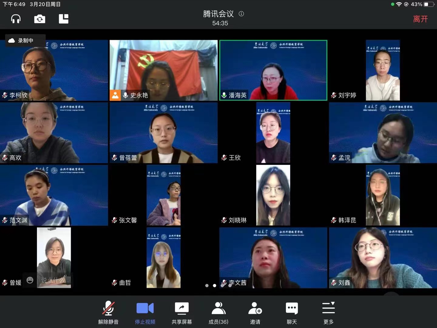 党员们相聚云端,通过重温入党誓词、线上深入学习习近平总书记疫情防控重要指示、党员线上交流及院长分享等议程,让与会党员们凝聚起共抗疫情的精神力量。潘院长带领党员们一起线上学习疫情工作重要指示,对学生党员提出了三点要求:坚定政治信念;加强自我管理;增长知识和学识。曾媛老师关心同学疫情学习生活,勉励学生党员面对疫情,也要不断自我提升,不负青春和时间。虽是线上学习,党员们的学习热情不减,分享自己最近的思想动态,坚持携手抗疫、共克时艰,坚信疫情终将过去,吉林定会迎来春暖花开。