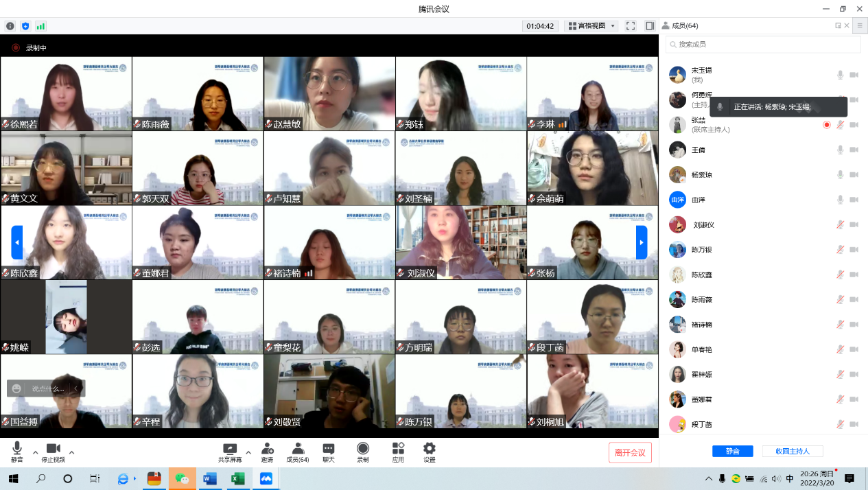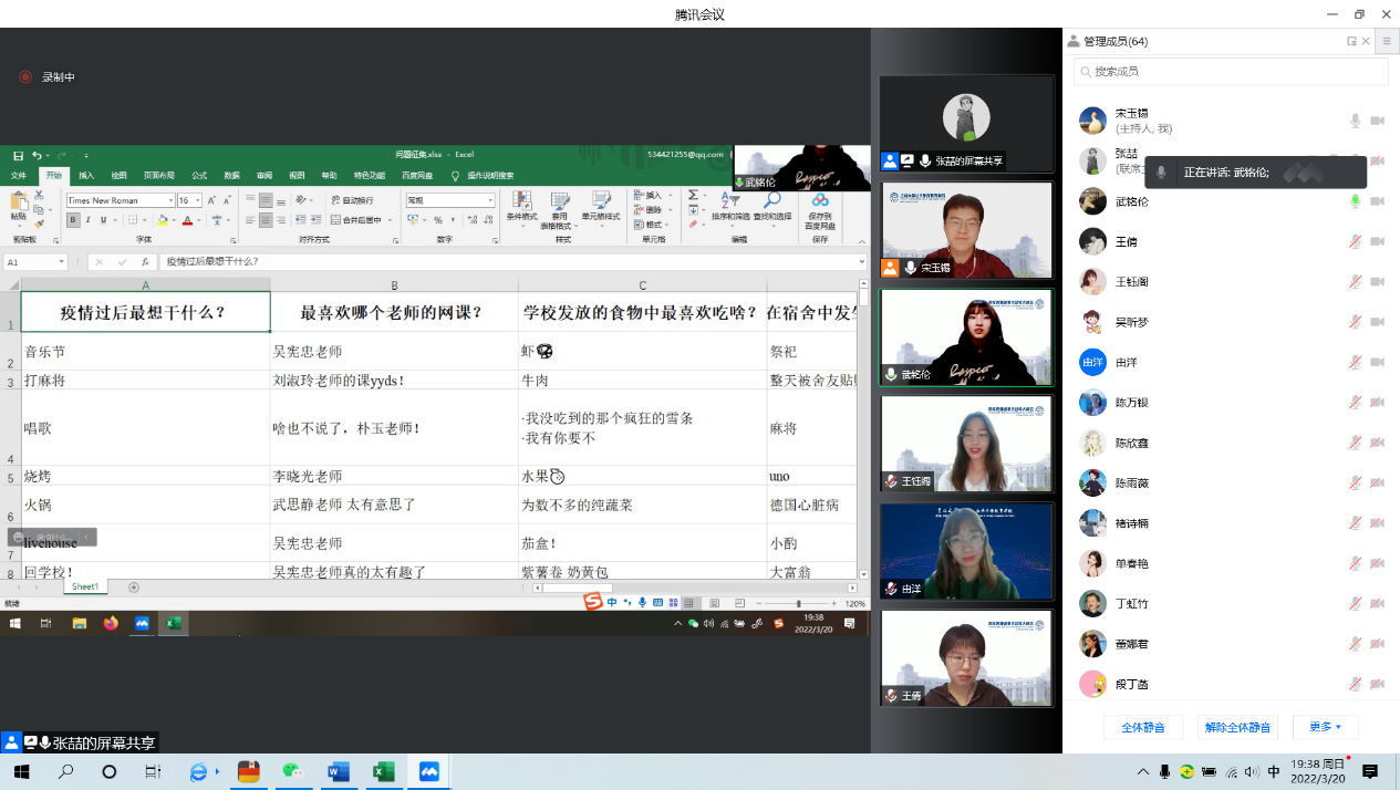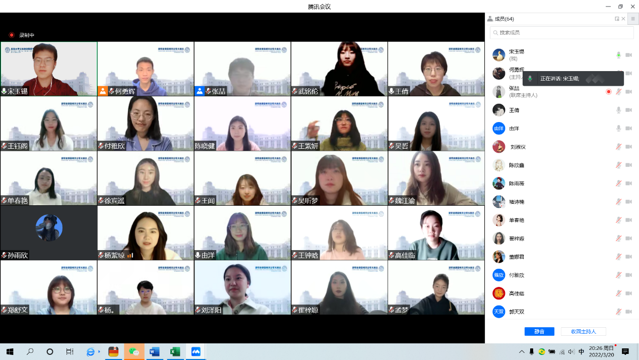 为进一步了解同学们在目前的生活状态,帮助学生关注自己和家人的情绪,排解在线学习中的困扰,公共外语教育学院于3月20日晚上19:30举办了心理引航计划——“Speak out your mind”2021级硕士主题线上班会。在辅导员曾媛老师的指导下,本次主题班会由2021级班长宋玉锡同学主持开展。