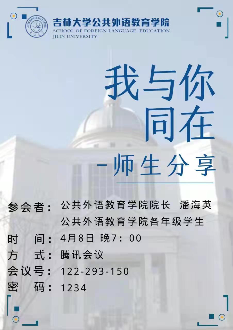 2022年4月8日,公共外语教育学院线上举办了“心理引航”计划——“我与你同在”师生分享会。本次会议邀请了公共外语教育学院院长潘海英教授、党委副书记徐杰老师参加,会议由研究生辅导员曾媛主持,全体硕士研究生参会。