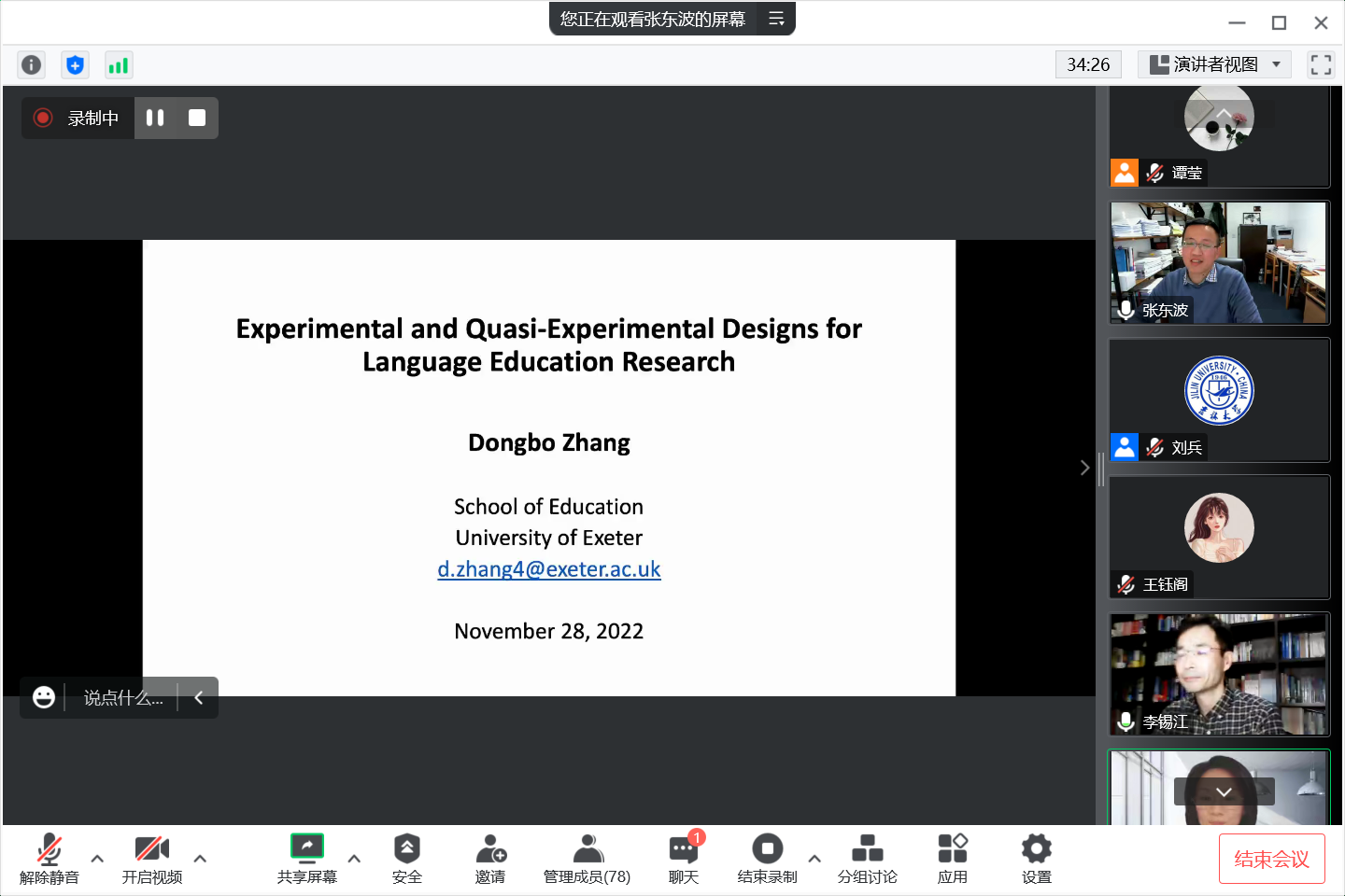 应亿德体育(中国)体育官方网站邀请,国际知名应用语言学学者、英国埃克塞特大学Zhang Dongbo教授,于2022年11月28日在线上进行专题学术讲座。讲座由副院长张锦教授主持,校内外广大教师和学生参加了此次讲座。