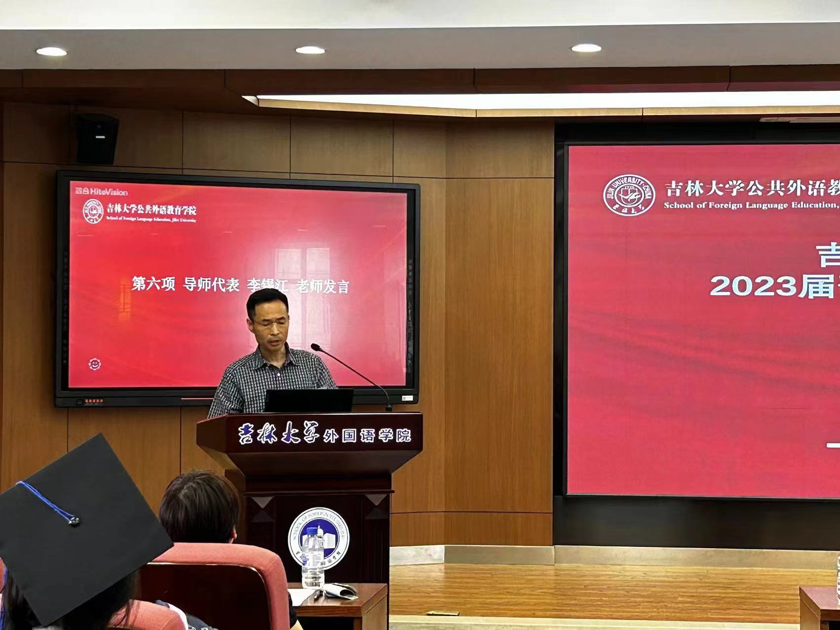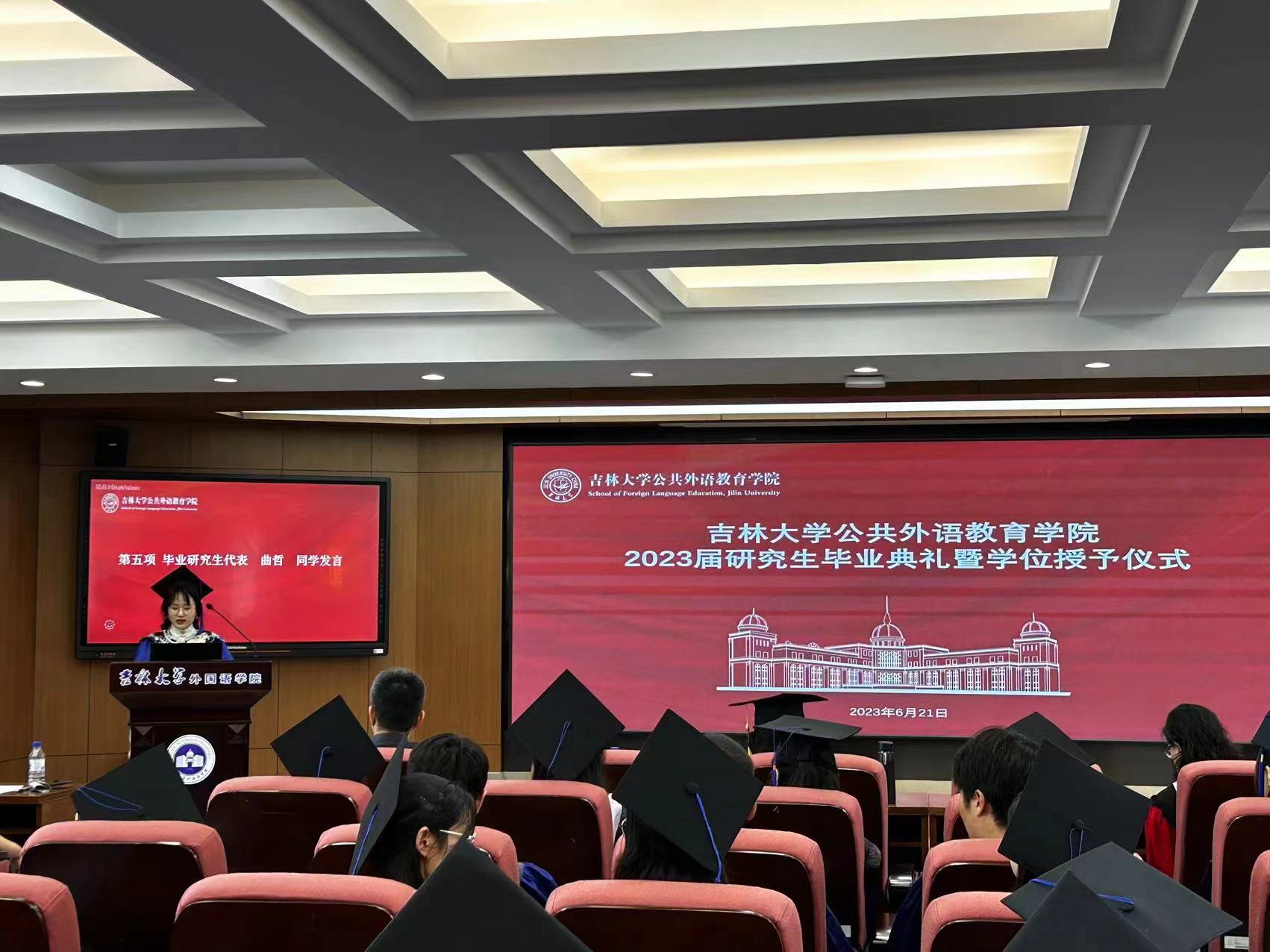 硕士研究生代表曲哲同学代表2023届全体毕业生向长期以来给予全心关怀、教导和帮助的领导示以最隆重的感谢,对老师的培育示以最崇高的敬意。她感叹时光瞬息,吉大公外见证了自己从初生牛犊的“盲目”自信变得谦逊踏实,从肆掠青春的浮夸躁动变得务实奋进。三年的校园时光,是最美好的青春。满怀着对学院的不舍与感激,曲哲同学希望公共外语教育学院欣欣向荣、再谱华章,祝愿吉林大学再创辉煌。