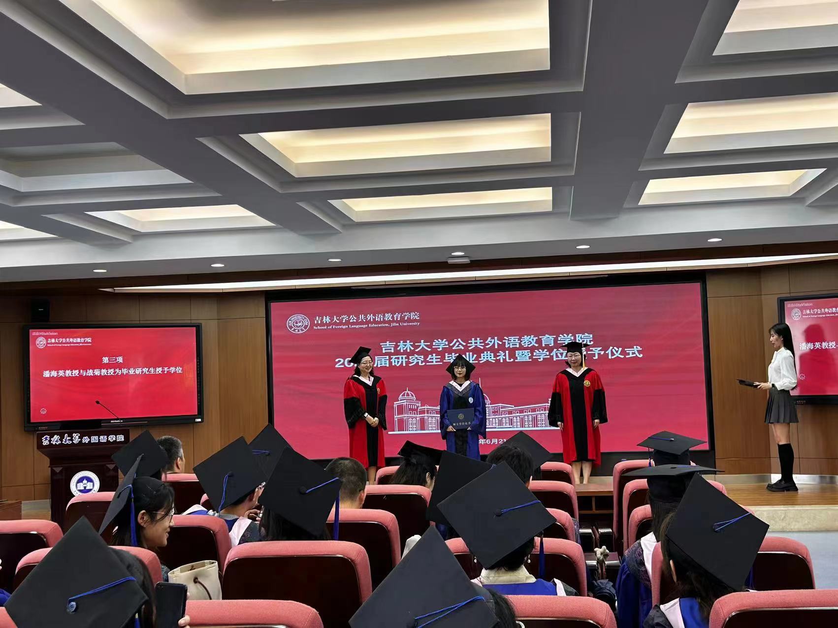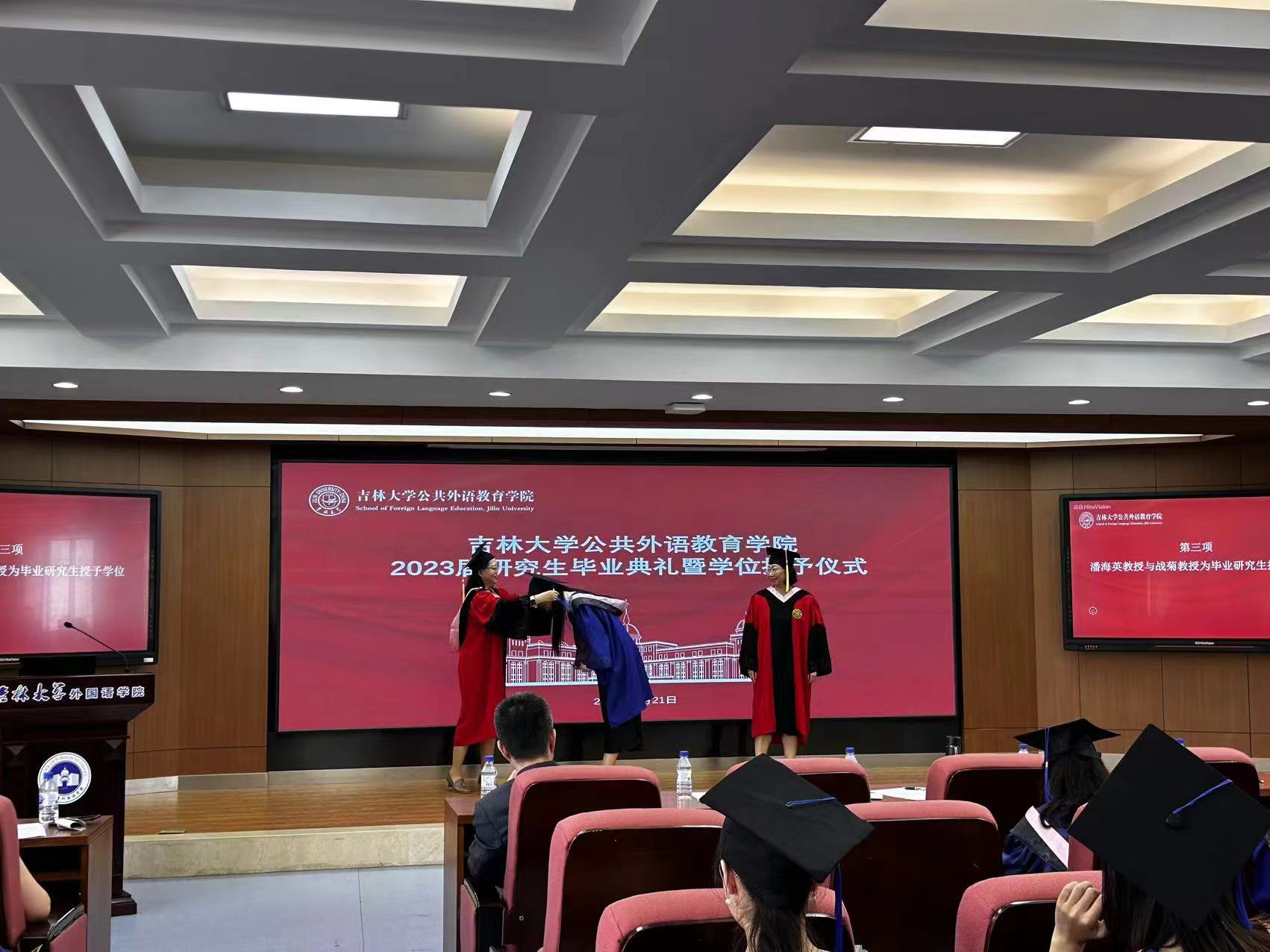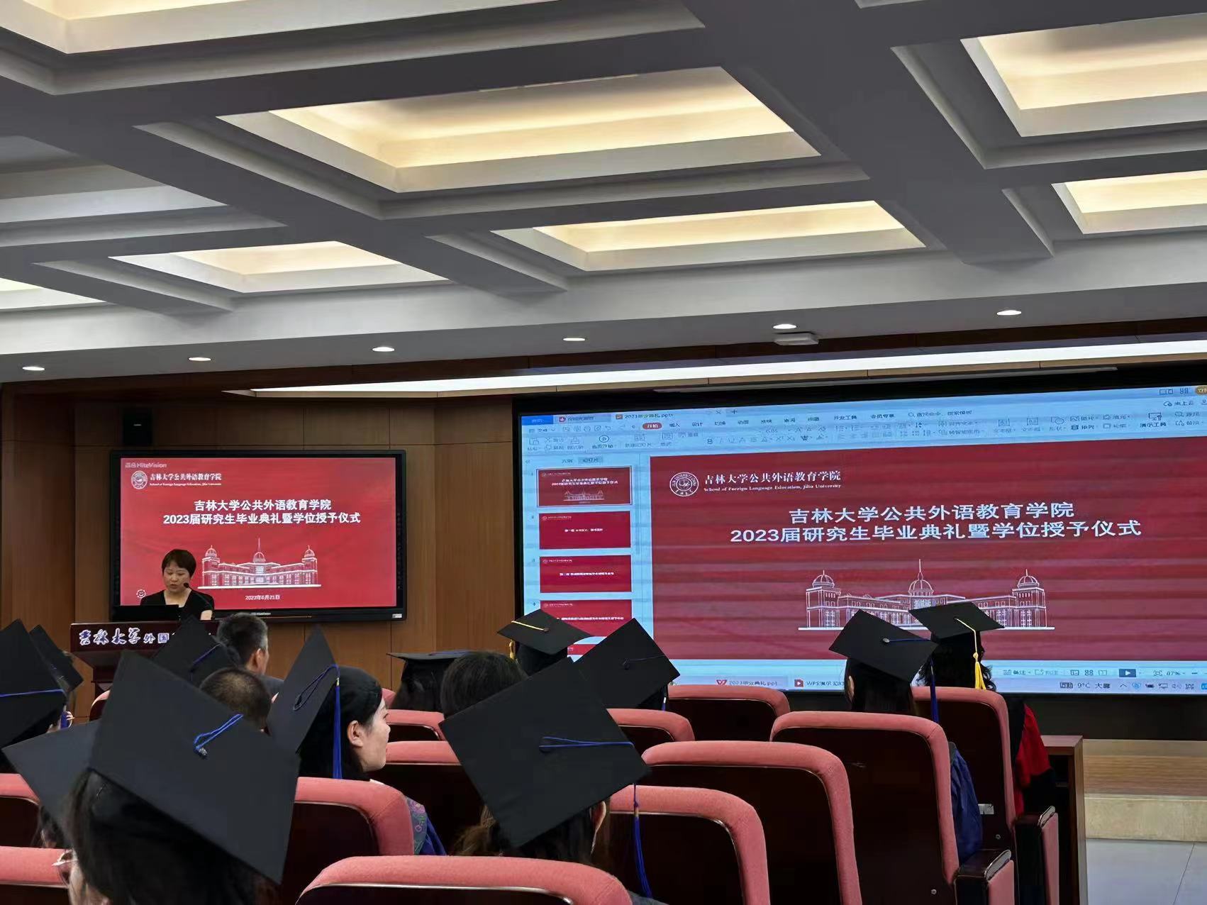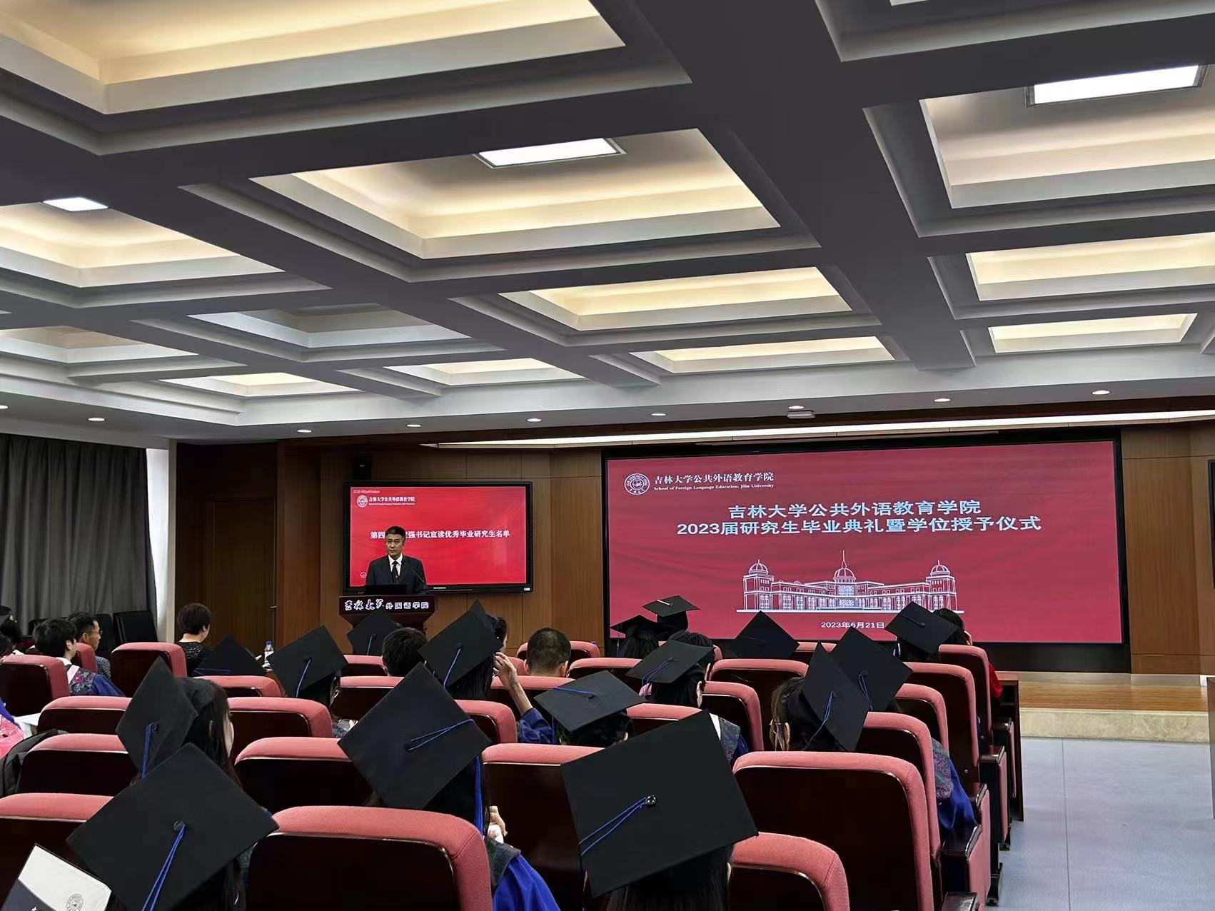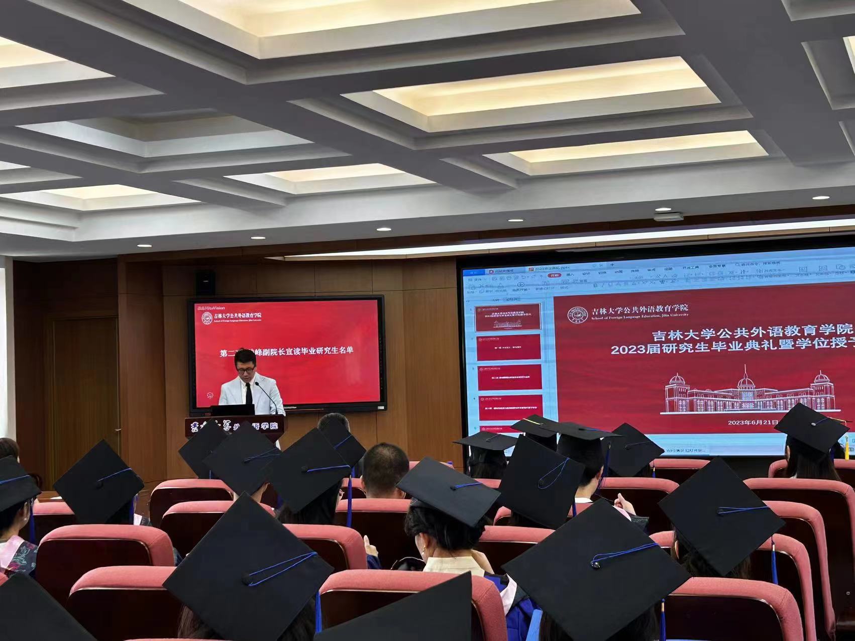 六月仲夏,繁花似锦,硕果累累。2023年6月21日上午9点,公共外语教育学院在外语楼五楼报告厅隆重举行2023届研究生毕业典礼暨学位授予仪式。公共外语教育学院学院全体领导班子成员、学院学术委员会主任战菊教授、研究生导师代表李锡江教授等出席典礼,2023届全体毕业研究生参加典礼。典礼由学院党委副书记徐杰主持。