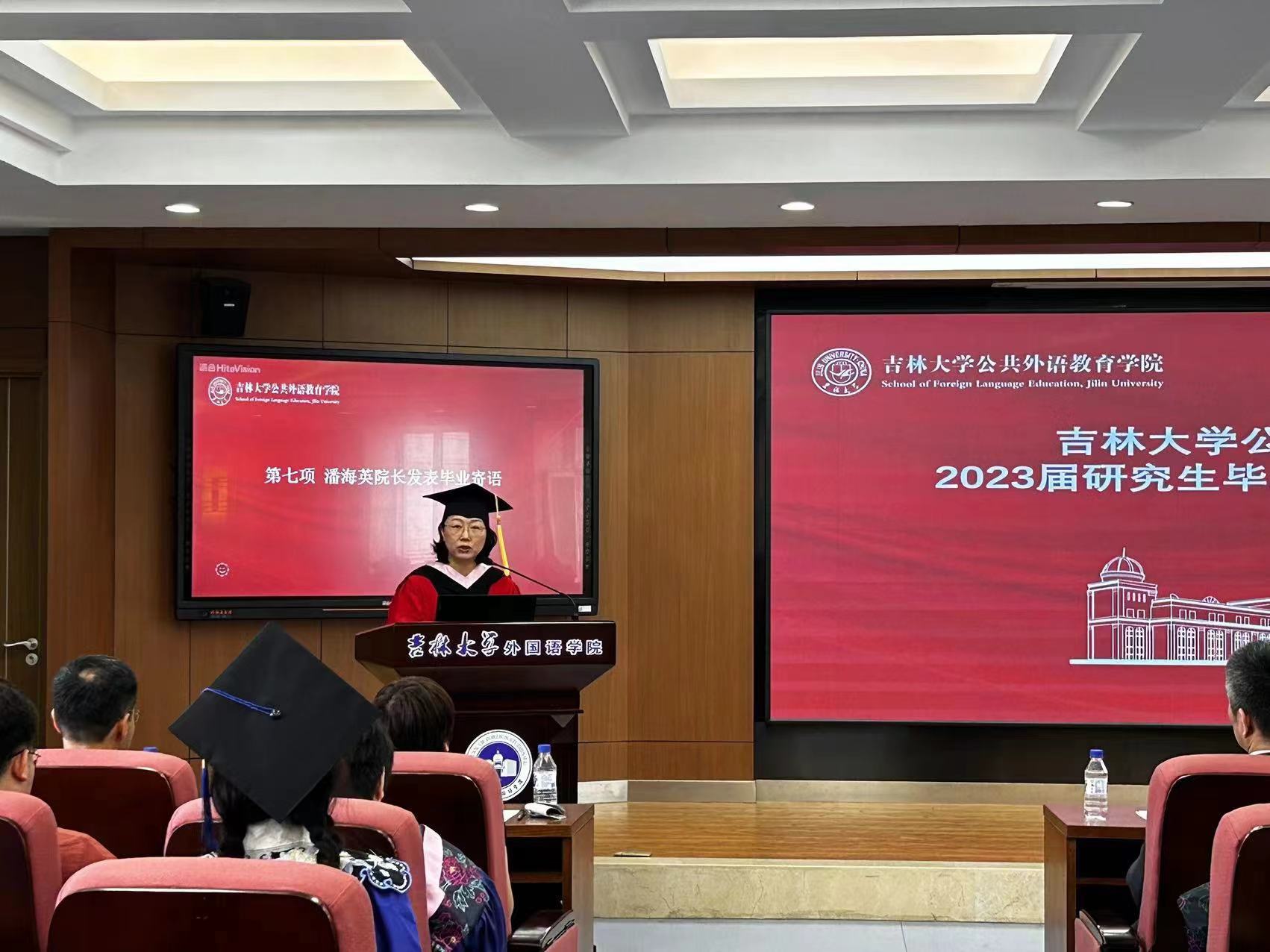 潘海英院长见证了2023届毕业生的学习和成长,赞扬了2023届毕业生的社会责任感和关爱精神,他们积极响应国家和学校的号召,以不同方式参加疫情防控的同时,积极投入学习,认真探索、不断前行,蕴含的底气、希望和向上的力量;肯定了学院前进的每一个脚步,取得的每一项成果,都凝结着全校师生、在座各位同学的心血和不懈努力。院长寄语2023届毕业生:始终有锲而不舍、与时俱进两种力量澎湃于心,坚守初心使命、坚毅执着把梦想深深扎根前进道路;“坚持学习,追求卓越;⼼怀家国,放眼世界;讲好中国故事,传播中国声音”。愿2023届毕业生在未来的日子里有趣有盼,常有知识滋养,总有梦想相伴,更有“荡胸生层云”的旷达和“猛志固常在”的力量!
