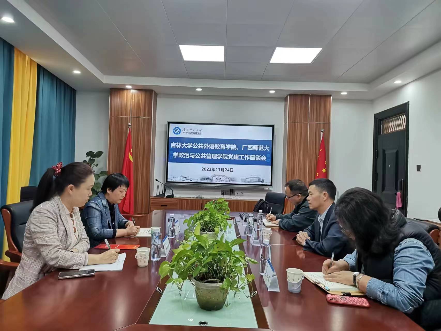座谈会上,何广寿对我院一行的到来表示热烈欢迎,介绍了广西师范大学政管学院的总体情况,概述了以“目标管理”为导向,以“业绩管理”为抓手的党建引领工作的经验方法。并希望能与公共外语教育学院能有更加密切的往来。社会学与社会工作系教工党支部书记覃琮就广西师范大学政治与公共管理学院社会学与社会工作系教工党支部入选“全国党建工作样板支部”培育创建单位并于2022年顺利通过验收,并获批第二批高校“双带头人”教师党支部书记工作室的丰富经验开展分享。他从扎实推进“七个有力”建设和聚焦“三个特色”建设两个方面进行介绍,提出党支部工作应探索形成党建与业务“双融共促”的机制;创新“一支部一特色”提质聚力建设,打造“党建+乐群公益”工程等品牌活动,在师生中取得了良好的反响。最后,双方人员针对在党建工作中出现的痛点、难点进行了热烈讨论,共同厘清理念思路,共商党建工作高质量发展之计。