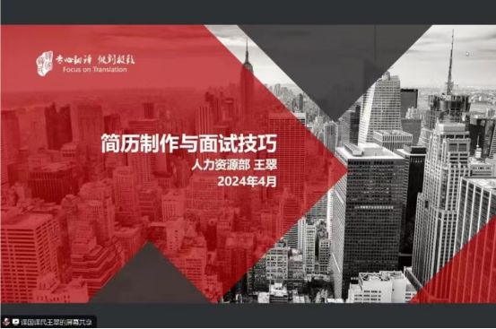 为提高人才培养质量,帮助硕士研究生丰富面试技巧,掌握面试要点,为未来面试就业打下良好基础,2024年4月9日晚6点,公共外语教育学院特邀译国译民集团开展了“简历制作与面试技巧讲座”。本次讲座由译国译民王翠老师主讲,辅导员林明帅和各年级研究生同学积极参与。
