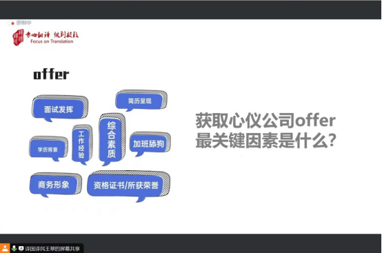 王翠老师结合自身作为面试官的经验,列举了获取心仪公司offer最关键的几个因素,包括学历背景、商务形象、工作经验、简历呈现、面试发挥等等。王翠老师从简历制作、简历投递、面试技巧等方面,全面细致地向大家讲解了在求职面试时的准备工作以及注意事项。