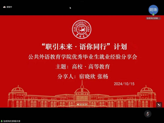 为引导研究生树立正确的择业观,帮助研究生更好地了解就业和升学形势、掌握技巧,公共外语教育学院于2024年10月15日晚和10月18日晚分别举办了“职引未来·语你同行” ——高校·高等教育就业经验分享会和申博升学经验分享会。分享会由学院就业兼职辅导员张明珠主持,学院2024届毕业生宿晓欣、张杨、2024级博士生马倩主讲,研究生辅导员林明帅和各年级研究生同学线上参会。
