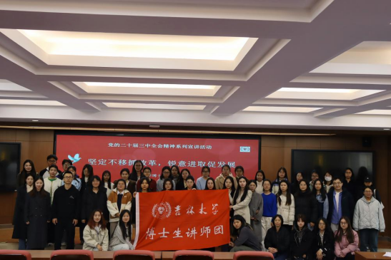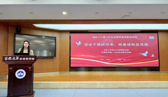 为深入学习宣传贯彻党的二十届三中全会精神,2024年11月8日,吉林大学博士生讲师团走进公共外语教育学院,开展以“坚定不移抓改革,锐意进取促发展”为题的党的二十届三中全会精神系列宣讲活动。本次活动由李颂婧讲师进行宣讲,公共外语教育学院辅导员林明帅,研究生一、三支部全体党员,入党积极分子及入党申请人等百余名研究生参加。