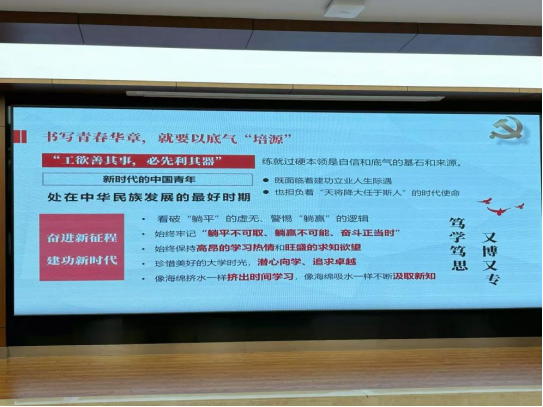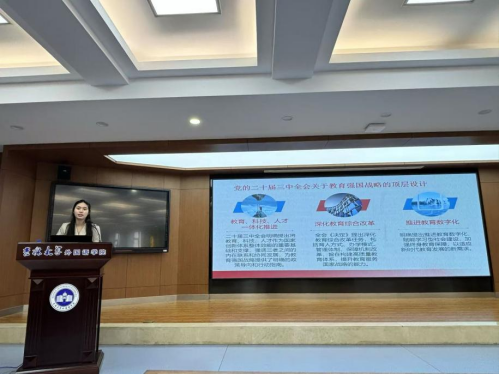 建设教育强国,是以中国式现代化全面推进中华民族伟大复兴的基础工程。李颂婧讲师从建设教育强国的重要性,百年党史的教育发展历程,新时代的青年担当三个方面展开宣讲。一、建设教育强国是在世界坐标系及对比中做强中国优势、补足短板,展示中国教育自信、凝练中国教育特色和推进中国教育现代化的发展模式。建设教育强国,提升教育国际影响力,是我国构建人类命运共同体、高水平扩大对外开放的重要战略路径。二、从百年党史中回顾教育发展历程,无论是新民主主义革命时期、改革开放时期还是党的十八大以来,立德树人的根本任务从未改变,其内涵却不断丰富,中国教育与中国共产党一直在政治思想纲领上同心同行,—代又一代教育工作者为中国共产党人的精神谱系源源不断地贡献着教育的智慧和力量。三、对于当代青年,若矢志教育报国,就要以骨气“立魂”,书写青春华章,就要以底气“培源”。新时代的中国青年,处在中华民族发展的最好时期,要始终牢记 “躺平不可取,躺赢不可能、 奋斗正当时”,成为中国式现代化建设的主力军。