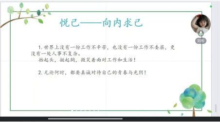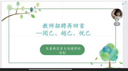 刘彤从三个方面展开,分别为“阅己”、“越己”、“悦己”。“阅己”为了解自己,刘彤结合自身经验,鼓励大家要明确目标,在择业时采用减法,筛选岗位。“越己”为超越自己,是精心准备、刻意训练。刘彤提醒大家在面试求职时,要根据面试内容进行训练,对相应内容进行模板化处理,同时对目前的教学理念要具有敏锐度。“悦己”即乐观真诚。刘彤引用一位中学校长的话,鼓励大家保持乐观积极的心态,并结合自己毕业工作经历,提倡真诚对待工作学习。